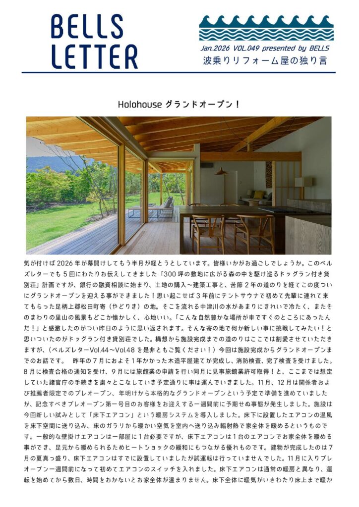 独立開業以来、3か月に1回のペースで発行しているニュースレターです。 リフォームのこと、建築のことはもちろん、普段の生活や家族のこと、お役立ち情報などとりとめもなく書き綴ったもので、少しでも多くの方にベルズのことを知ってもらいたいという思いからはじめました。
