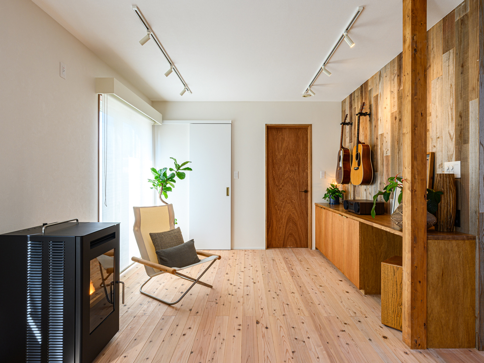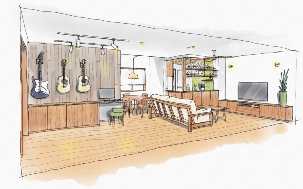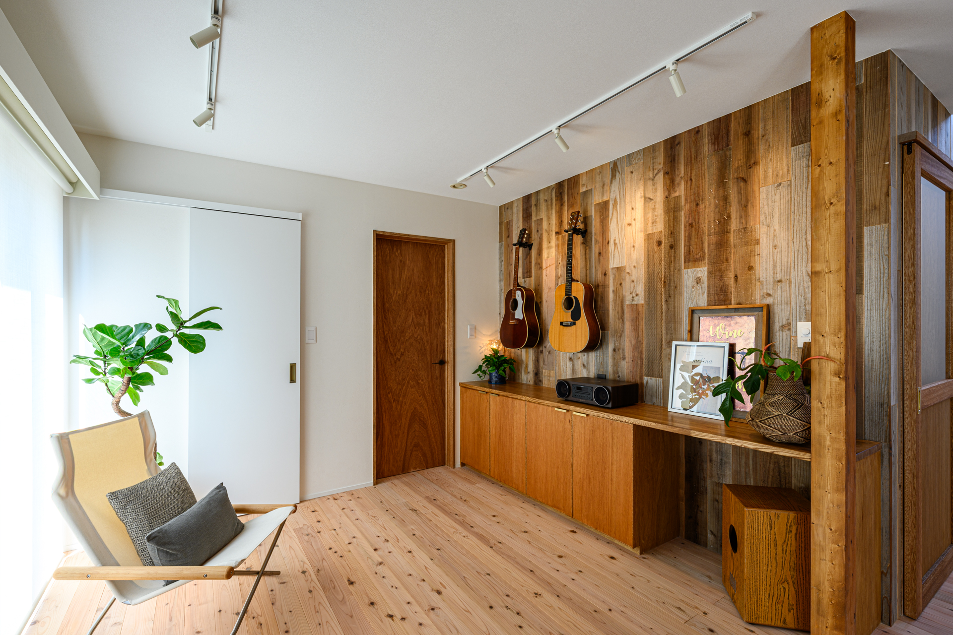 まず、和室とリビングを仕切っていた壁を取り払い、ワンフロアの開放的なLDKへ再構築。ソファの配置によって、リビングスペースと演奏や家族団らんなど多用途に使える多目的スペースをゆるやかにゾーニングしました。楽器が多いご家庭のため、壁面にはディスプレイ兼収納として活用できるギター専用スペースを計画し、見せる収納として空間のアクセントとなるようデザインしています。