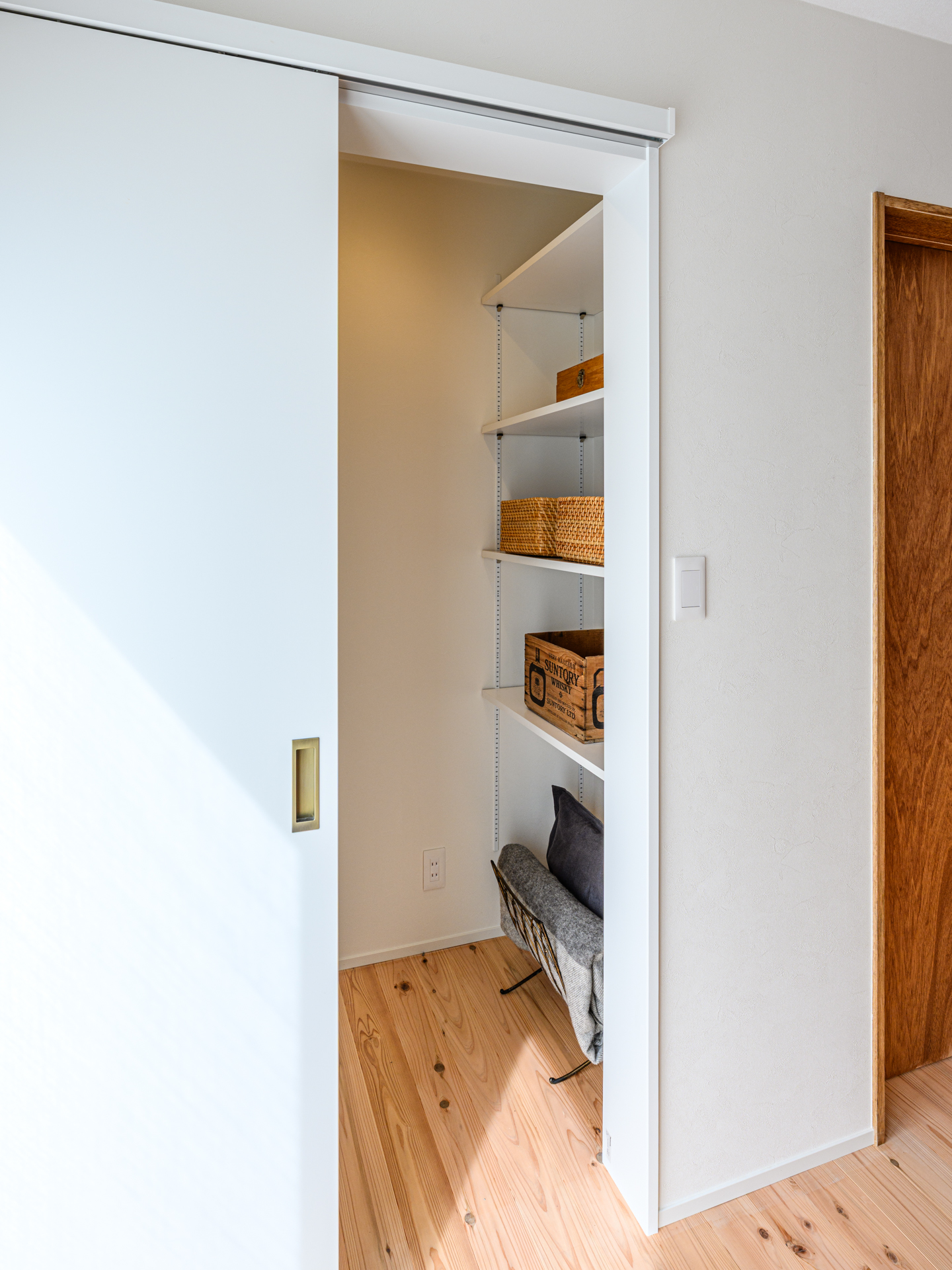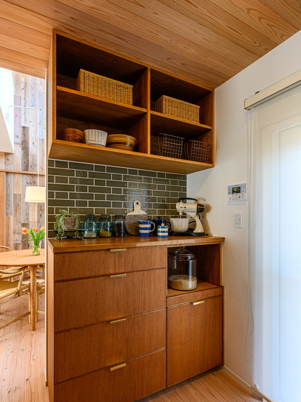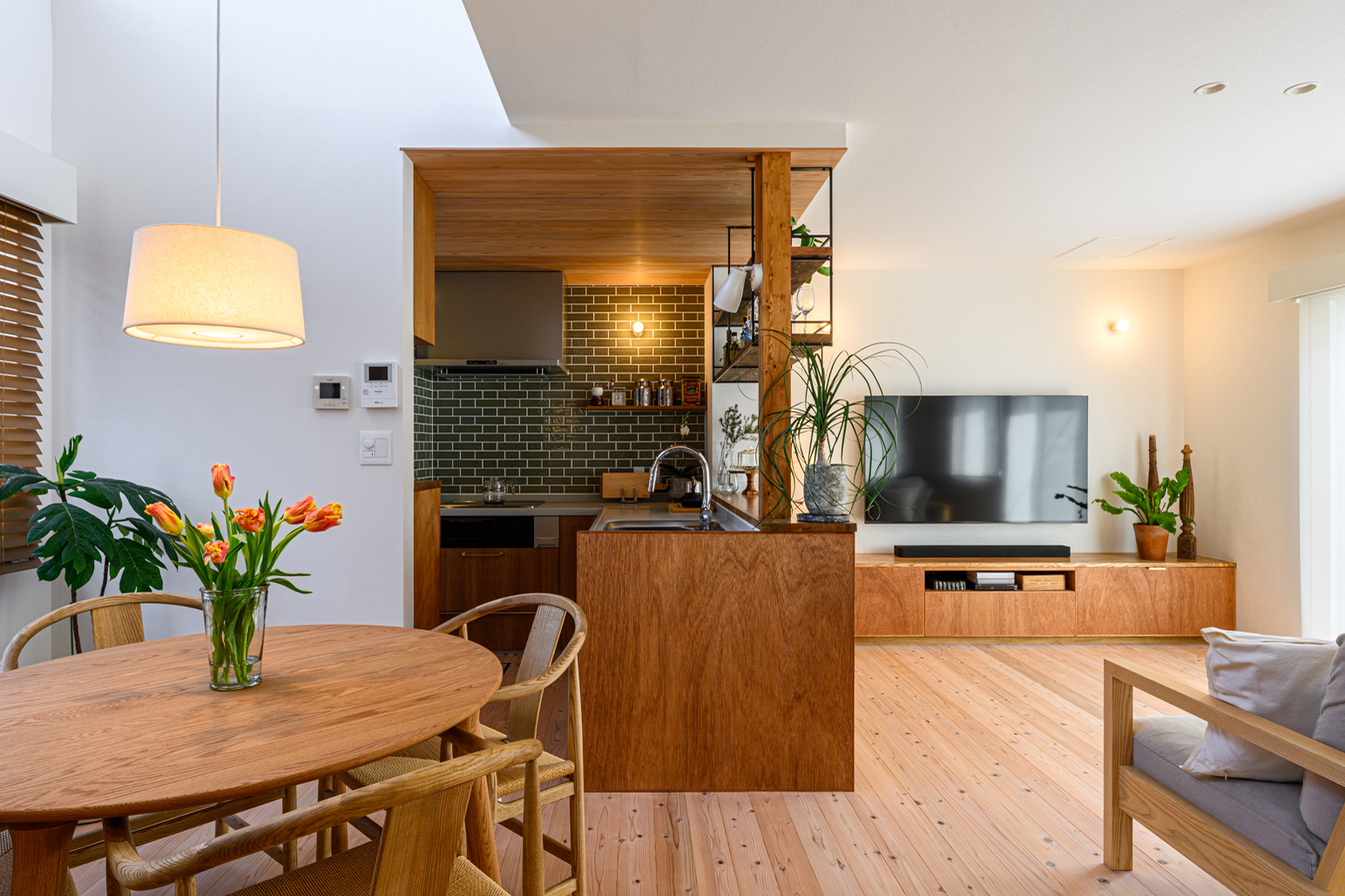また、収納不足のお悩みに対してはウォークインクローゼット(WIC)を新設し、衣類や日用品をまとめて収納できるよう計画。さらに、ギター収納と同様に、キッチンの対面収納やカップボード、TVボードなど、各エリアに合わせた造作収納を設け、空間に自然と溶け込むようご提案しました。