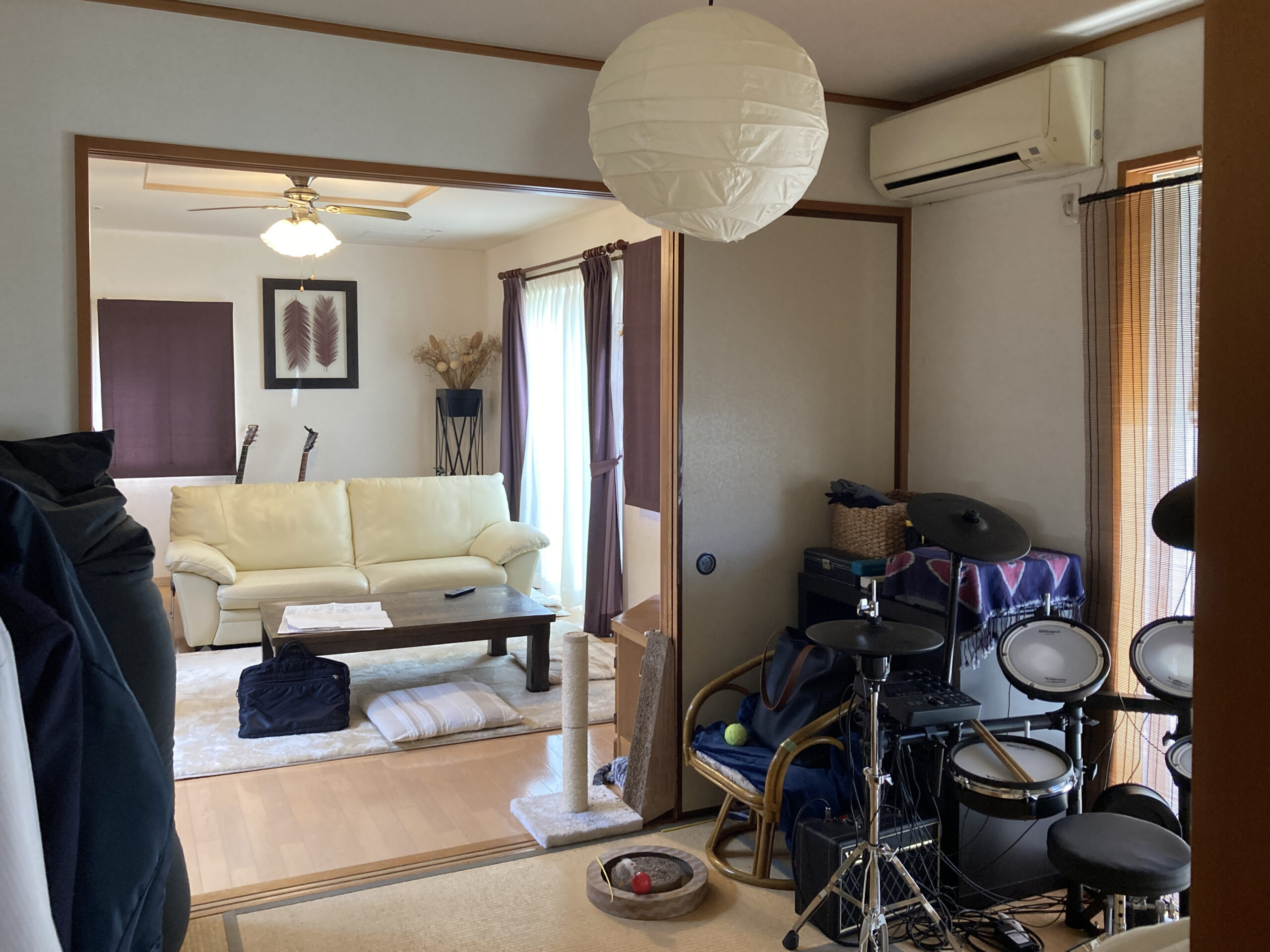 現在、A様はご夫婦と息子さん、そして猫3匹とともに木造戸建てにお住まいです。ご家族皆さま音楽がお好きで、1階ではよく演奏を楽しまれています。そのため室内にはギターやドラム、電子ピアノなどの楽器が多く置かれており、収納が限られていることから空間の使い方にお悩みでした。