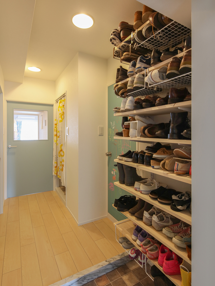 内装は床には松の無垢材、天井、壁には薩摩霧島壁と自然素材を使用。また水回りも含め、室内の建具、家具、収納類は全て造作し、扉はラワン材に自然塗料を塗布してそのまま仕上げに。既製品にはない素朴な風合いとぬくもりが感じられる内装に仕上がりました。